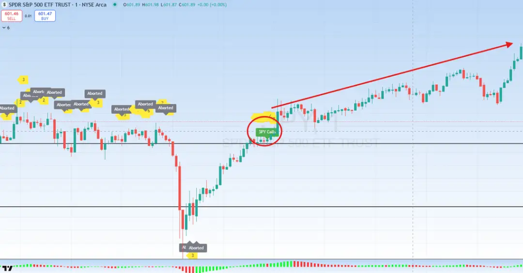 Once the price breaks out of that zone in either direction, the algorithm starts a countdown to trade execution — usually between 5 and 8 minutes, depending on the specific algo. With each closing 1-minute candle, you'll see the countdown progress. If the breakout fails or reverses, an Abort Signal will print and the countdown resets. Once a breakout is confirmed, the algorithm signals it’s time to enter the trade.