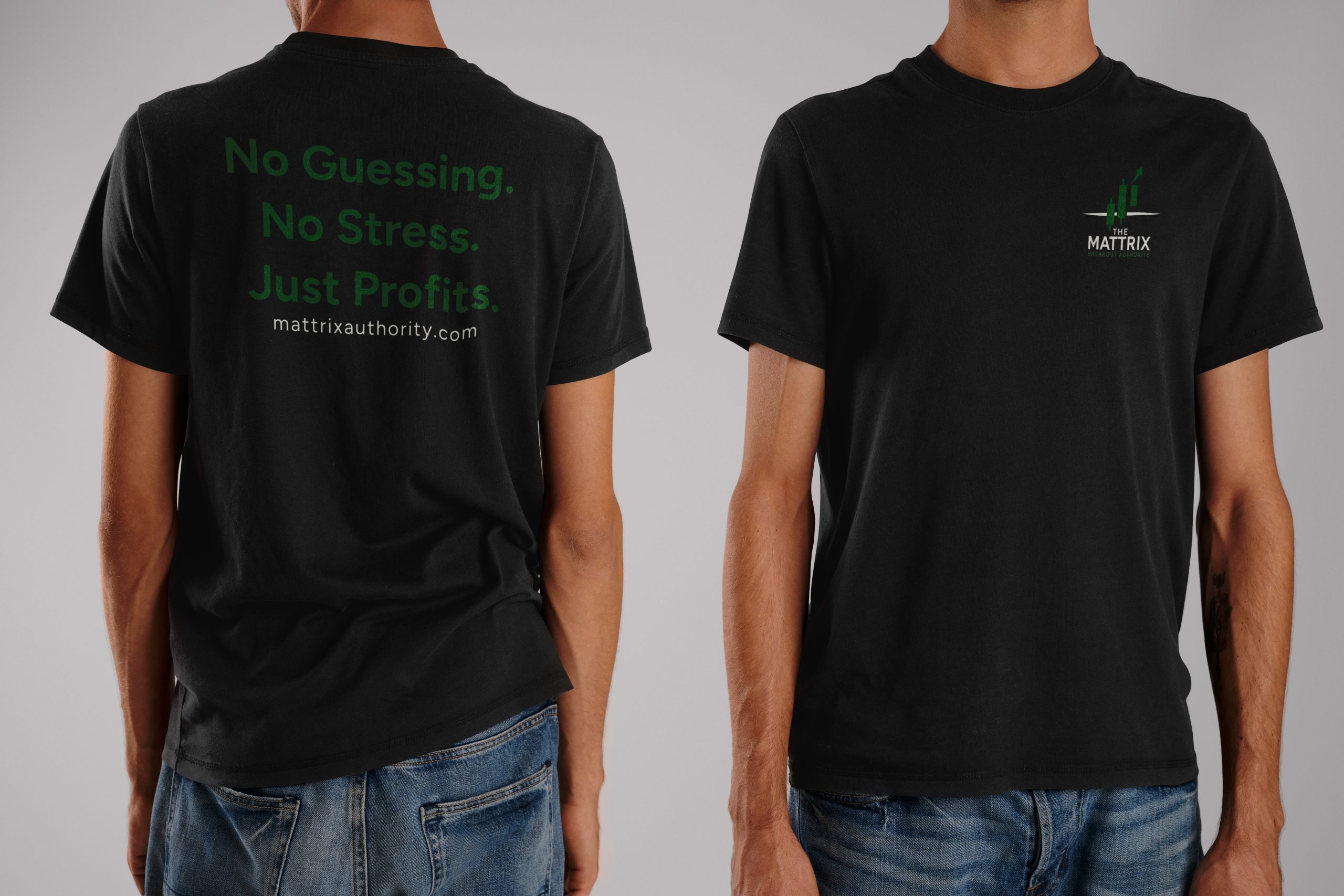 Trade in style with the official Mattrix Authority black t-shirt. Designed for comfort and confidence, this premium tee features the Mattrix logo on the front (upper left) and our signature tagline printed on the back: